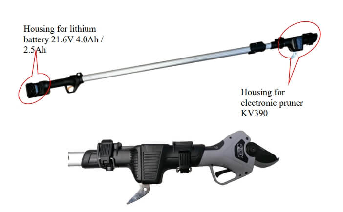 Volpi KV390 EXT220 is ontworpen voor iedereen die al de KV390 accusnoeischaar heeft aangeschaft en snoeiwerkzaamheden op hoogte wil uitvoeren. Dankzij de KV390EXT220 is het mogelijk om de KV390 snoeischaar aan het ene uiteinde te plaatsen en de lithiumbatterij, die normaal in de snoeischaar wordt geplaatst, aan het andere uiteinde. Op deze manier beschikt u over een snoerloos gereedschap op een steel. De telescopische verlenging is verstelbaar in 5 posities, van 155 tot 225 cm.